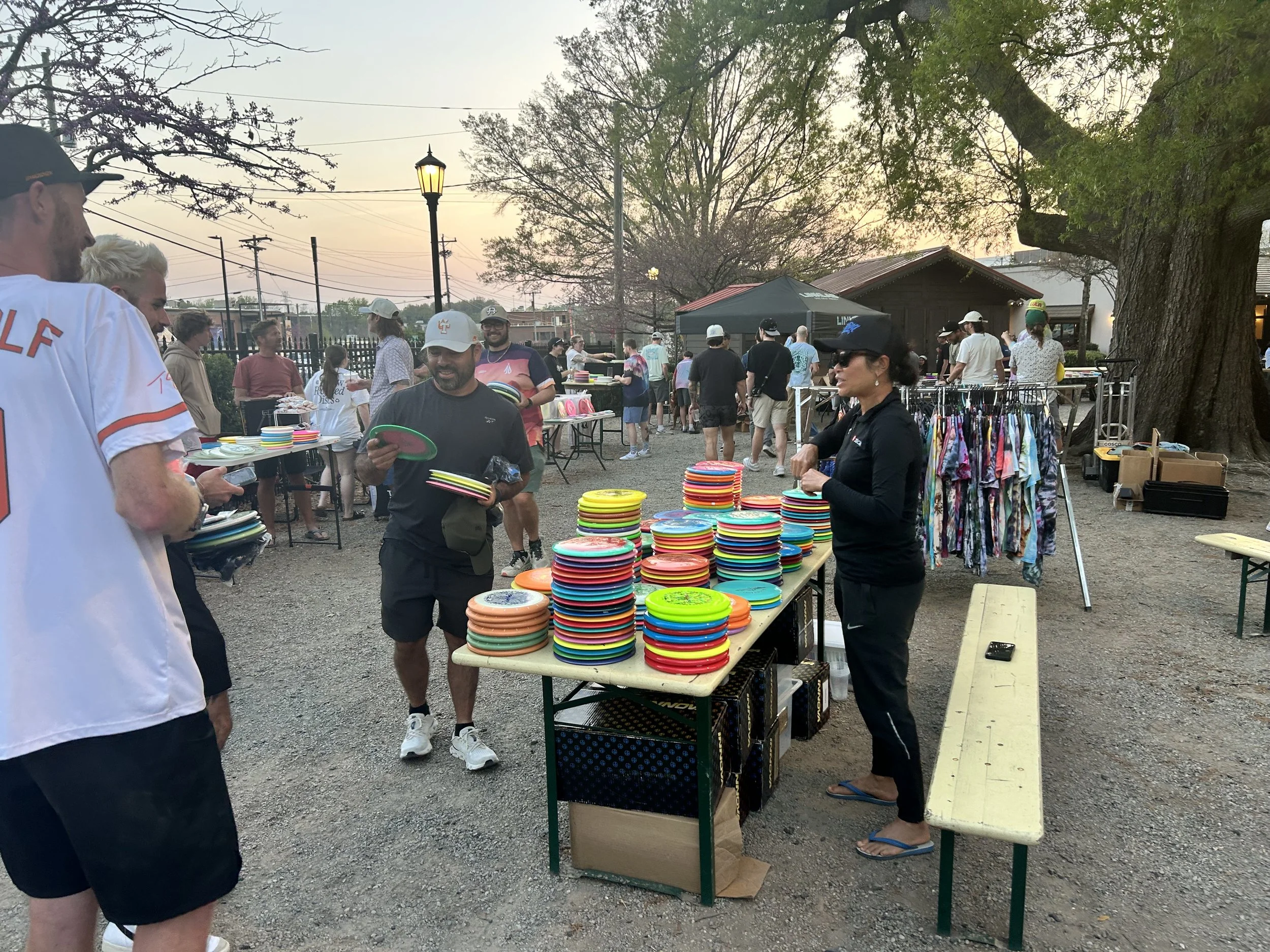 The chill vibe continued at the tournament site. Parking was free; checkin took us 30 seconds. Just outside the course, a quiet disc carnival was going on in a small tent village. Disc manufacturers displayed their discs for sale; a couple from Charlotte sold resin bags they’d sown themselves; food trucks served food. Players, male and female competitors, pre-round and post-round, were all there, just hanging out.