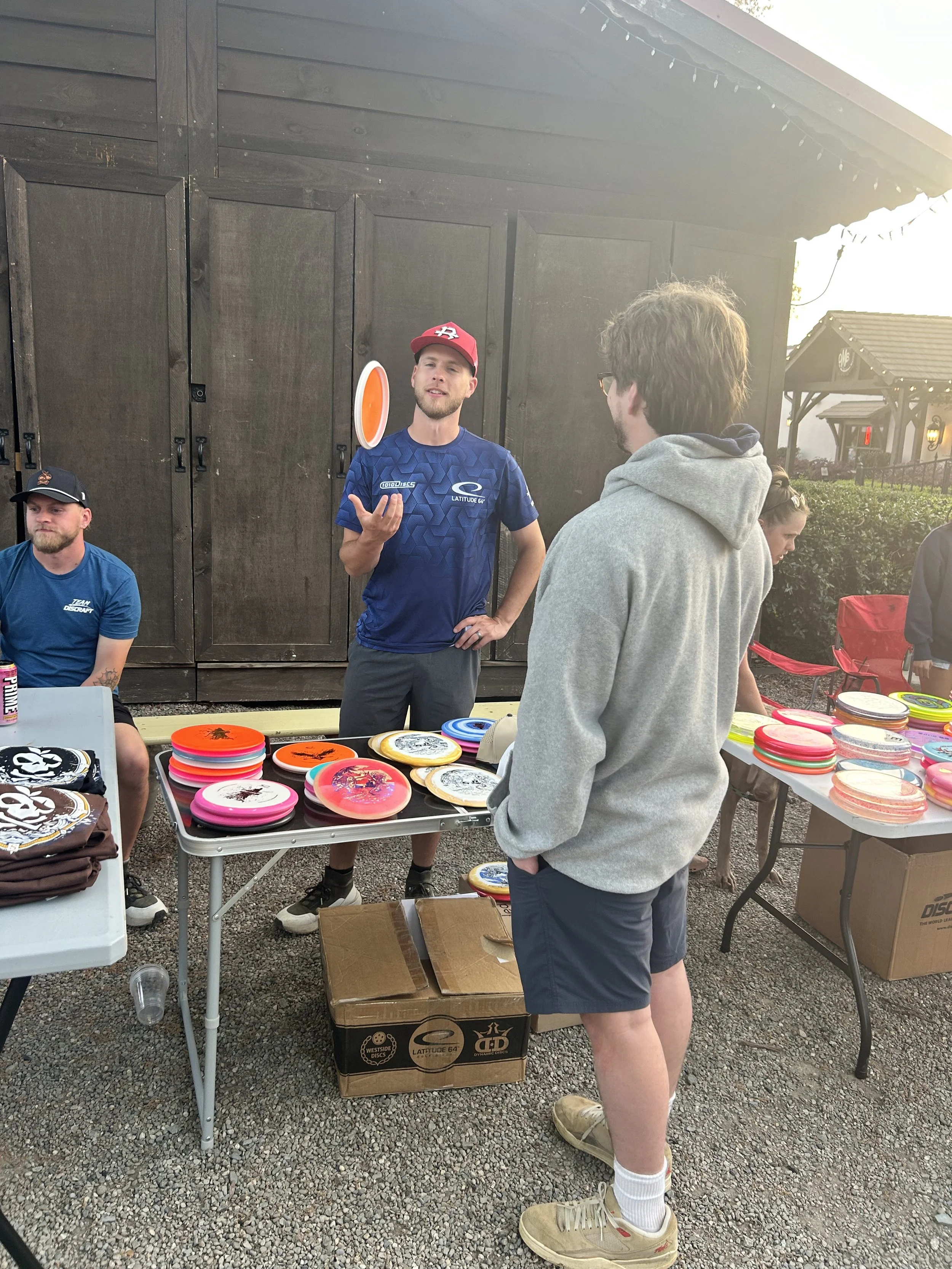 Instead we walked in to a beer garden, turned right and almost collided with two-time world champion Isaac Robinson, who was standing behind a table stacked with colorful round plastic objects, doing his endorsement duty as a brand representative for the disc maker Latitude 64.