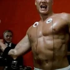 Rocky moves to Siberia to prepare for the fight. In the mandatory Rocky training montage, we see him getting ready by running through snowbanks in sweatpants, chopping down very large trees, lifting bags of boulders on a pulley, pulling Paulie in a dog sled and helpfully lifting one of his Siberian neighbors sleighs out of the ice. Horses snort in shock; KGB spies shake their heads in amazement. Meanwhile, Drago trains, indoors and in spandex, every inch of flesh covered with sensors, every punch measured by some sort of 80’s computer. And then, in case we were still on the fence over who to root for, we see him getting needlefuls of some sort of clearly evil juice in his arm.