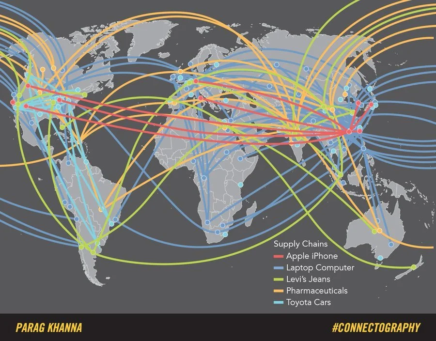The creation of products across a broad range of sectors is no longer bilateral — one countries “makes” and another country “buys”; it involves cooperation among multiple nations (image from Parag Khan’s book Connectography)
