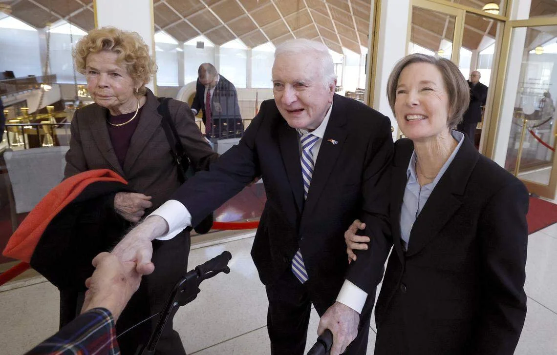 Jim Hunt (center) in one of his last public appearances earlier this year — with wife Carolyn (left) celebrating the first day of daughter Rachel (right) serving as the state’s Lieutenant Governor (photo Ethan Hyman).