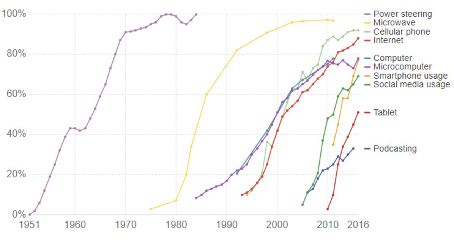 The speed with which we adopt technologies means we do many things more efficiently… and have to change jobs more often.(image from Visualcapitalist.com)